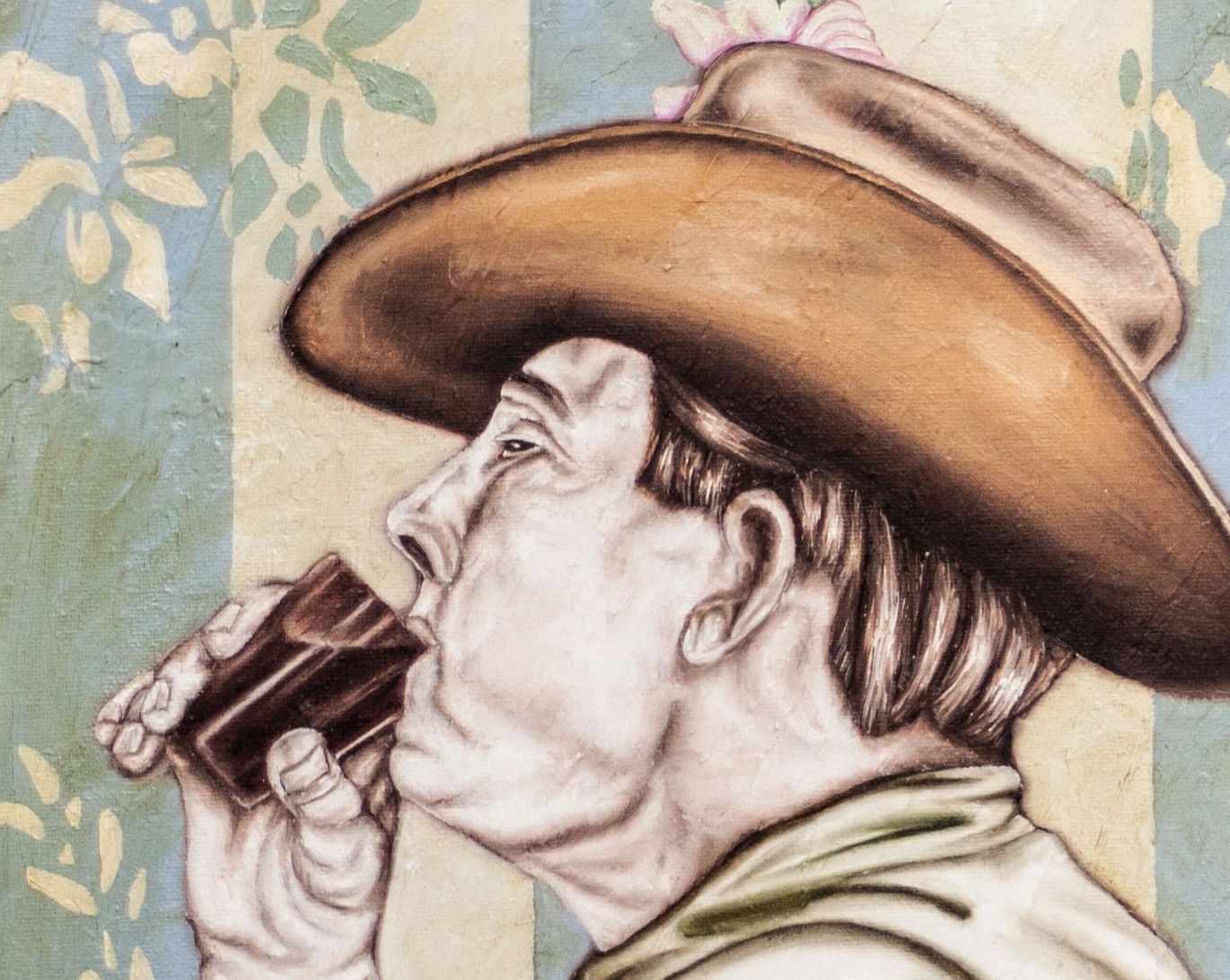 In Bottoms Up, the figure is presented in a dramatic side view, emphasizing the gesture of drinking as a central narrative moment. The exaggerated brim of the hat and the deliberate cropping of the figure heighten the sense of theatricality, transforming a simple act into a moment of visual storytelling.