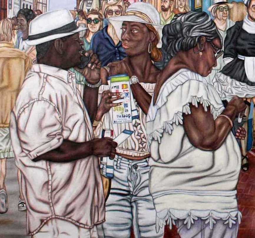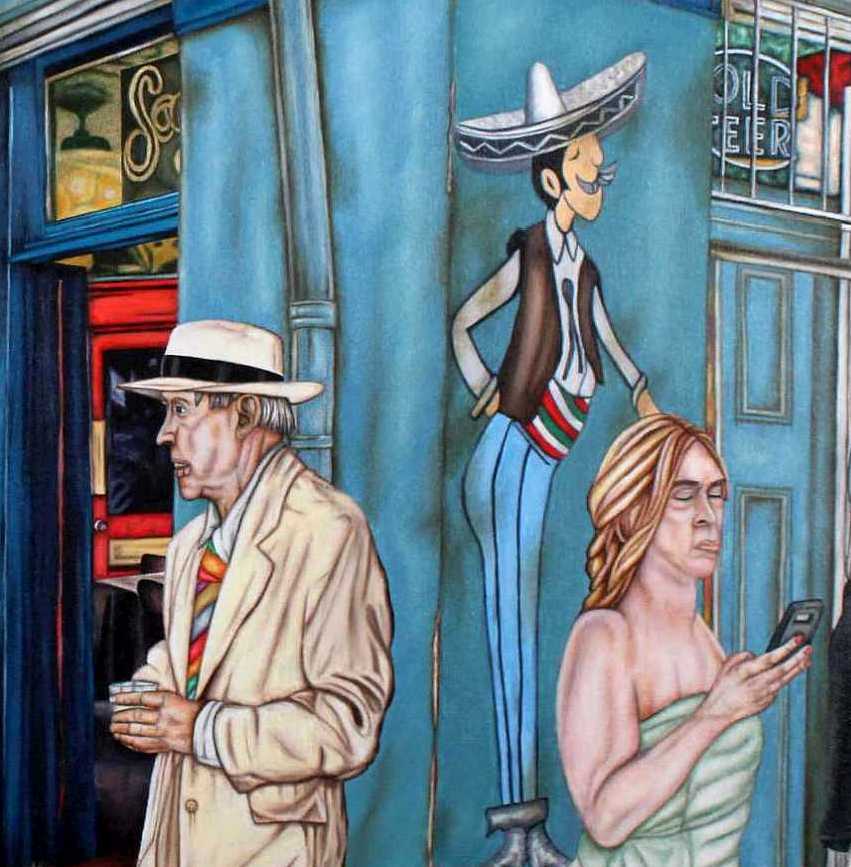 The painting invites viewers to linger and explore its details: the rhythm of the architecture, the interactions between passersby, and the subtle humor and tension found in everyday urban life. Rather than focusing on a single subject, the work unfolds like a stage set in which multiple small dramas occur simultaneously.