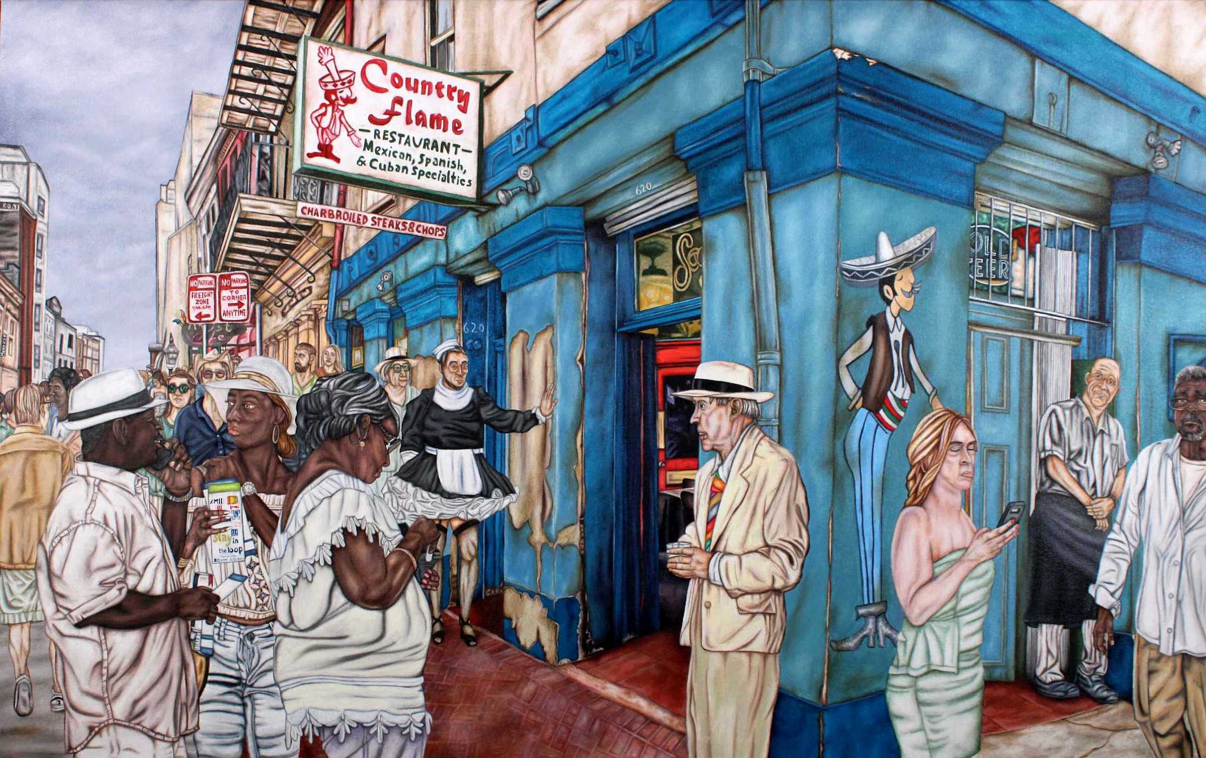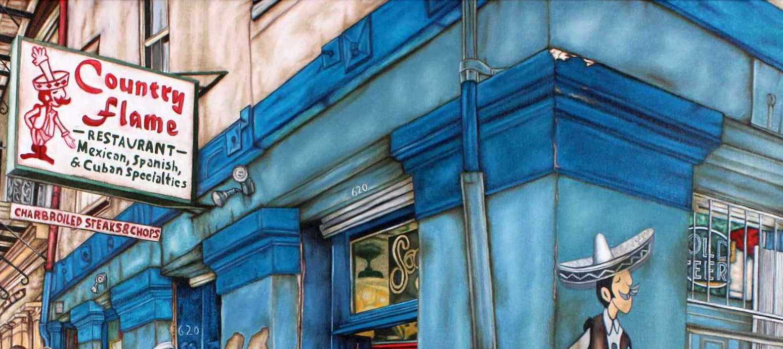 Country Flame presents a vivid street scene centered around the entrance of a now extinct neighborhood restaurant at the corner of Iberville & Exchange Place in the Vieux Carré, New Orleans. The blue facade and vintage signage anchor the composition, while a diverse cast of figures gathers along the sidewalk, each absorbed in their own quiet narrative.
